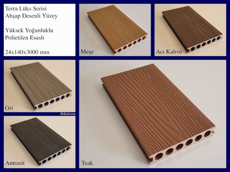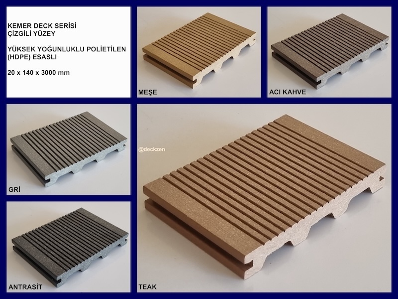 Ahşap Görünümlü Kompozit Deck Kaplamalar iki yüzeyi farklı desene sahip, kaymaz ve antibakteriyel özelliğe sahiptirler.